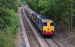 - 20/9: Sechs Lokomotiven mit den Nummern 20 901 bis 20 906, die 1989 von Hunslet-Barclay gekauft und in Kilmarnock aufgearbeitet wurden. Die Höchstgeschwindigkeit wurde auf 100 km/h (60 mph) herabgesetzt, die Vakuumbremse entfernt.[12] Die Lokomotiven wurden für Unkrautbekämpfungszüge eingesetzt[15] und machten die Klasse 20 zur ersten Baureihe von Lokomotiven im Privatbesitz, die auf dem öffentlichen Streckennetz verkehren durften.[9] Die Lokomotiven wurden Anfang 1999 an DRS verkauft, zwei gelangten über Harry Needle Railroad Company (HNRC) im Januar 2024 in den Besitz des Bauunternehmens Balfour Beatty, das die Lokomotiven zusammen mit einem Kanalreingiungszug verwendet.[16]