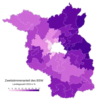 Bei der Landtagswahl am 22. September 2024 erreichte das BSW 13,5 Prozent und 14 Sitze.[16] Als BSW-Landtagsabgeordnete wurden gewählt: Robert Crumbach, Jouleen Gruhn, Stefan Roth, Niels-Olaf Lüders, André von Ossowski, Melanie Matzies-Köhler, Falk Peschel, Sven Hornauf, Jenny Meyer, Andreas Kutsche, Reinhard Simon, Christian Dorst, Gunnar Lehmann und Oliver Skopec.[17]