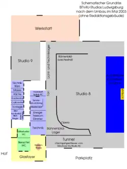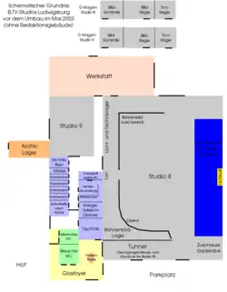 Das Gelände umfasste zwei TV-Studios (darunter ein 1800 m² großes „Studio 8“ mit einer ausfahrbaren Tribüne für 1500 Zuschauer), zudem die Sendeabwicklung, Werkstätten und ab Mitte 2000 eine Astra-Uplink-Parabolantenne.[16] Die technischen Anlagen ermöglichten einen volldigitalen Sendebetrieb. Die Büros von Redaktion und Geschäftsführung, sowie die Schnittplätze befanden sich im historischen Verwaltungstrakt der Kühlschrankfabrik Eisfink. Die Räume waren zudem nach den Gesetzen des Feng Shui ausgestattet und im Empfangsbereich mit einem riesigen, im Boden eingelassenen, Yin-Yang-Symbol ausgestattet. Der Sender besaß zudem eine beachtliche Flotte von 10 Ü-Wagen,[16] welche zumeist gebraucht von anderen TV-Sendern erworben waren. (Eine fest eingebaute Bild- und Tonregie gab es anfangs in Ludwigsburg nicht.) Im Laufe der Jahre wurde die Produktion von immer mehr Sendungen von Karlsruhe nach Ludwigsburg verlagert.