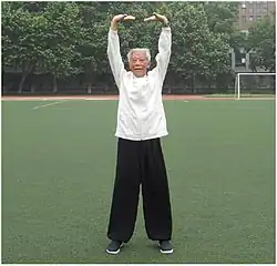 Ausgangsstellung: Den Oberkörper in eine gerade Position bringen. Die Füße parallel stellen, schulterbreit auseinander. Die Arme hängen an den Seiten des Körpers. Den Blick gerade nach vorne richten. Die Zunge berührt den Gaumen. Natürlich atmen und den ganzen Körper entspannen. 1. Mit der Einatmung die Hände vor dem Körper von unten nach oben führen bis auf Brusthöhe. Dabei zeigen die Handflächen nach oben, die Fingerspitzen zueinander und der Daumen ist im rechten Winkel abgespreizt. Diese Handposition heißt Tigermaul (HuKou). 2. Mit der Ausatmung drehen die Hände über die Schulter nach oben. Die Ellenbogen dabei hinaus zu den Seiten schieben, Handflächen nach oben. Am Ende der Bewegung zeigen die Fingerspitzen in Richtung des Halses etwas unterhalb der Ohrläppchen. 3. Mit der Einatmung die Hände in unveränderter Position so weit wie möglich nach oben strecken. HuKou einander gegenüberstellen. Den Blick nach vorne richten, dabei die Fersen vom Boden lösen. 4. Mit der Ausatmung werden die Hände bogenförmig zurück in die Ausgangsstellung gebracht. 5. — 8. Die gleichen Bewegungen 1 — 4 werden wiederholt. Die Bewegungen 1 — 8 zweimal oder viermal ausführen.