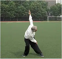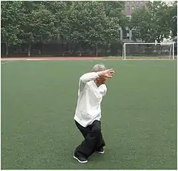 Ausgangsstellung: Die Füße nebeneinander stellen. Die Arme hängen an den Seiten des Körpers. 1. Bei der Einatmung mit dem linken Fuß einen Schritt nach links machen. Dabei die Arme seitlich nach oben bis auf Schulterhöhe anheben, die Handflächen schauen dabei nach unten. Anschließend den Körper um 90° nach links drehen, den Schwerpunkt auf den linken Fuß verlagern. Die rechte Ferse dabei anheben. Beide Beine sind gestreckt. 2. Mit der Ausatmung den Körper um 90° nach rechts drehen. Der linke Arm geht dabei nach oben und der rechte Arm nach unten. Die Handflächen schauen dabei nach vorne. Während der linke Arm wieder nach unten geht, steigt der rechte Arm nach oben über den Kopf. Anschließend den rechten Arm im Ellbogen beugen, die Handfläche schaut nach vorne. Beim linken Arm die Finger und den Daumen zur Hakenhand (GouShou) schließen, d. h. die Spitzen des Daumens und der Finger werden zusammengebracht und das Handgelenk nach unten gebeugt. Während der Bewegung der Arme wird der rechte Fuß hinter den linken Fuß gesetzt. Dabei geht man in die Hocke und befindet sich dann in der Stellung des Ruhenden Schrittes (XieBu). Der Blick geht dabei zur linken Hand. 3. Mit der Einatmung wieder aufstehen. Den rechten Fuß zum schulterbreiten Stand zurücksetzen. Gleichzeitig beide Arme vor der Brust kreuzen, der rechte Arm wird über den linken Arm gekreuzt, die Handflächen zeigen zum Körper. 4. Mit der Ausatmung werden die Arme in einem Bogen zur linken und zur rechten Körperseite in die Ausgangsposition gebracht. Die Handflächen dabei nach außen drehen und gleichzeitig den linken Fuß wieder an den rechten Fuß heransetzen. 5. — 8. Die gleichen Bewegungen 1 — 4 werden in die entgegensetzte Richtung wiederholt. Die Bewegungen 1 — 8 zweimal oder viermal ausführen.