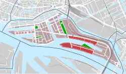 Lage des Quartiers Baakenhafen (rot) innerhalb des HafenCity-Projekts (hellrot)