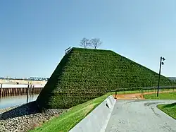 Der direkt im Wasser stehende Himmelsberg muss nicht nur Hochwasser standhalten, auch Eisbildung im Wasser, Treibgut oder Kontakte mit Booten dürfen dem Bauwerk keinen Schaden zufügen. Der Berg besteht überwiegend[12] aus hellem Elbsand, verstärkt und gesichert mit speziellen Geo-Gittern. Darüber befindet sich ein Trennvlies, das zwar Regenwasser durchlässt, aber den Sand nicht ausschwemmt. Unter dem mit Stahlgittern gehaltenen Rollrasen befindet sich eine Schicht Mutterboden. Planung, Berechnung und Statik stammen vom Ingenieurbüro Steinfeld und Partner mbB[13] aus Hamburg. Auf dem Berg stehen Holzbänke sowie zwei Bäume. Der Berg ist über eine Treppe mit etwa 40 Stufen begehbar und bietet nach Westen eine Aussicht bis zur Elbphilharmonie, nach Osten einen Blick nach Rothenburgsort und dem Bahnhof Elbbrücken und später auf den geplanten Amerigo-Vespucci-Platz,[14] nach Norden auf die Großmarkthallen und nach Süden einen Blick über die Norderelbe.