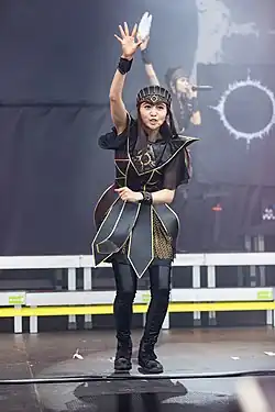 Die Begleitband von Babymetal bei Live-Auftritten ist die Kami Band (jap. 神バンド, Kami bando), die aus etablierten Sessionmusikern zusammengesetzt ist. Sie treten meist mit Corpsepaint und weißen Gewändern auf, seit 2019 tritt die Kamiband ausschließlich vollmaskiert auf.[68][74] Mit Ausnahme der Gitarristen, die sich abwechseln, ist die Besetzung der Kami Band gleich. Ihre aktuellen Mitglieder sind: