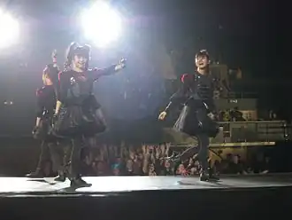 Eine Besonderheit der Live-Auftritte von Babymetal sind die synchronen Tänze, die parallel zum Gesang präsentiert werden – typisch im japanischen Idol-Pop, aber völlig ungewöhnlich im Metal-Genre. Jedes Lied besitzt eine eigene, zum Teil sehr komplexe Choreografie, die bis ins Detail einstudiert ist und zuweilen theatralische Züge annimmt. Die Hauptlast des Tanzens tragen Kikuchi und seit 2023 Okazaki (bzw. bis 2018 Mizuno und in der Zwischenzeit eine Ersatztänzerin), während Nakamoto als Leadsängerin die zentrale Position einnimmt und ein weniger anstrengendes Tanzpensum absolviert. Kreiert werden die Tänze von der Choreografin Mikiko Mizuno, die neben Babymetal unter anderem die Gruppen Elevenplay, Perfume und Sakura Gakuin betreut.[69] Die Bühnenkostüme sind von der in Japan populären Gothic-Lolita-Modeszene inspiriert. Sie bestehen üblicherweise aus Rüschenröcken in schwarzer Farbe sowie einem metallisch glänzenden Oberteil, das einer Rüstung nachempfunden ist.[70]