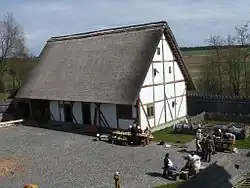 Die vollständig rekonstruierte Burg zeigt in der Kernburg einen Wohnturm auf einer niedrigen Motte, daran anschließend die Wirtschaftsgebäude der Vorburg.