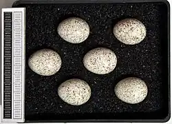 Die Eiablage erfolgt im Abstand von 24 Stunden meist eine halbe Stunde nach Sonnenaufgang. Der Legebeginn liegt in Mitteleuropa frühestens in der ersten Aprildekade, meist aber später im gleichen Monat.[25] Das Gelege besteht meist aus fünf bis sechs, seltener aus drei bis sieben Eiern, größere Gelege stammen vermutlich immer von zwei Weibchen. Die Eier sind oval, mattglänzend und auf hellgrauem bis weißlichem Grund fein graubraun bis dunkelgraubraun gesprenkelt. Sie sind durchschnittlich 20 × 15 mm groß und werden bei ungestörtem Brutverlauf elf Tage lang bebrütet. Unter ungünstigen Umständen kann die Brutdauer bis zu 17 Tage betragen. Das Männchen ist daran bis zu etwa einem Viertel der Zeit beteiligt, nachts brütet immer das Weibchen.[26]