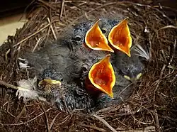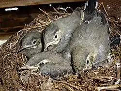 Die Jungvögel schlüpfen meist innerhalb von zwölf Stunden, in selteneren Fällen dauert dieser Vorgang bis zu 40 Stunden. Die Nestlingszeit dauert meist zwischen 13 und 14 Tagen. Die Nestlinge werden von beiden Altvögeln weitgehend zu gleichen Anteilen gefüttert. Während der ersten Tage, in denen das Weibchen hudert, trägt das Männchen den größeren Anteil, gegen Ende der Nestlingszeit lässt dessen Fütterungsaktivität aber stark nach.[27] Nach dem Ausfliegen werden die Jungvögel noch 4–7 Tage, seltener bis zu 11 Tage lang gefüttert.[28]