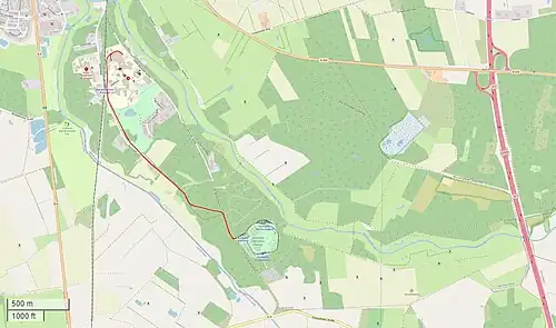 ![]() Trasse der Moorbahn der Rheumaheilstätte Bad Bramstedt um 1975 (rot) und Gleise der Oskar-Alexander-Kurbahn (schwarz) auf einer Karte von 2022 | |