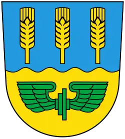 Blasonierung: „Geteilt durch einen Wellenschnitt; oben in Blau drei goldene Ähren balkenweise; unten in Gold ein grünes Flügelrad mit offenem Flug.“[13] |