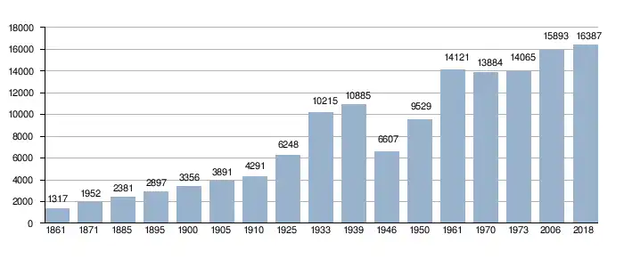 Die Tabelle und das Diagramm zeigen die Einwohnerzahlen der Stadt Bad Oeynhausen bis 1972 und ab 1973 des Stadtteils Bad Oeynhausen nach dem jeweiligen Gebietsstand. Eine relevante Änderung des Gebietsstandes ergab sich durch die Eingemeindung eines Teils der Gemeinde Lohe am 1. April 1926 (1925: 2942 Einwohner). Bei den Zahlen handelt es sich bis 1970 um Volkszählungsergebnisse[5][6][7]. Die Angaben beziehen sich ab 1871 sowie für 1946 auf die Ortsanwesende Bevölkerung und von 1925 bis 1970 auf die Wohnbevölkerung. Vor 1871 wurde die Einwohnerzahl nach uneinheitlichen Erhebungsverfahren ermittelt.