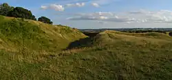Das ca. 100 m hoch gelegene, sieben Hektar große Fort wurde von drei ca. 15 m hohen Holzwällen und vier bronzezeitlichen Grabhügeln umgeben, die auf die frühere Bedeutung des Platzes hinweisen. Auf einem Stein eines der Hügelgräber sind in England sehr selten auftretende Ritzungen zu erkennen. Sie stellen Dolche, axtförmig eingezogene Dreiecke und Cup-and-Ring-Markierungen dar, wie sie ganz ähnlich auch auf Stein 53 in Stonehenge vorkommen.
