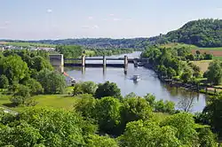 Der Rhein ist der wasserreichste Fluss des Landes. Mit ihm ist Baden-Württemberg an eine der bedeutendsten Wasserstraßen der Welt angeschlossen. Sein Einzugsgebiet (ohne Neckar) im Land ist etwa 11.000 km² groß.[20] Im 19. Jahrhundert wurde der Oberrhein ausgehend von den Plänen des badischen Ingenieurs Tulla begradigt. Er bildet mit wenigen Ausnahmen die westliche Landesgrenze zu Frankreich und zu Rheinland-Pfalz. Hochrhein, Seerhein und Bodensee bilden den größten Teil der südlichen Landesgrenze zur Schweiz.