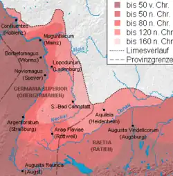 Der Landweg zwischen Mainz und Augsburg war strategisch sehr wichtig. Um diesen zu verkürzen, bauten die Römer um 73/74 n. Chr. eine Straße durch das Kinzigtal im mittleren Schwarzwald; zum Schutz dieser Straße gründeten sie Rottweil. Weitere Gründungen dieser Zeit sind Ladenburg, Bad Wimpfen, Rottenburg am Neckar, Heidelberg und Baden-Baden; eine Siedlungskontinuität ist jedoch nur für Baden-Baden, Ladenburg und Rottweil wahrscheinlich. Die später gebaute Straße über Bad Cannstatt verkürzte den Weg zwischen Mainz und Augsburg noch weiter. Die Landnahme in Südwestdeutschland sicherten die Römer durch Feldzüge im heutigen Hessen ab. Um 85 n. Chr. gründete Kaiser Domitian die Provinz Germania superior (Obergermanien).