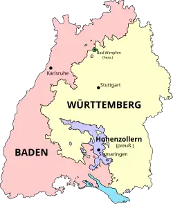 Baden-Württemberg (Abkürzung BW; amtlich Land Baden-Württemberg) ist ein Land im Südwesten von Deutschland.[5][6] Gemäß seiner Verfassung hat es die Staatsform einer parlamentarischen Republik und ist ein teilsouveräner Gliedstaat der Bundesrepublik Deutschland. Das Land entstand 1952 durch den Zusammenschluss der nach dem Zweiten Weltkrieg gebildeten Länder Württemberg-Baden, (Süd-)Baden und Württemberg-Hohenzollern. Somit steht es in der Tradition der alten Länder Baden und Württemberg sowie der Hohenzollernschen Lande. Baden-Württemberg ist naturräumlich geprägt von seinen Anteilen an der Oberrheinischen Tiefebene und Mittelgebirgen wie dem Schwarzwald, dem Südwestdeutschen Schichtstufenland mit der Schwäbischen Alb und dem Alpenvorland nördlich des Bodensees. Sowohl nach Einwohnerzahl als auch bezüglich der Fläche steht Baden-Württemberg an dritter Stelle der deutschen Länder. Bevölkerungsreichste Stadt Baden-Württembergs ist die Landeshauptstadt Stuttgart, gefolgt von Mannheim und Karlsruhe. Weitere Großstädte sind Freiburg im Breisgau, Heidelberg, Ulm, Heilbronn, Pforzheim und Reutlingen.