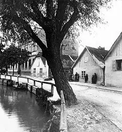 ![]() Ausleitung des Mühlbachs gegenüber der Ostspitze des Holzrechenplatzes (1910) [Anm. 1] | ||