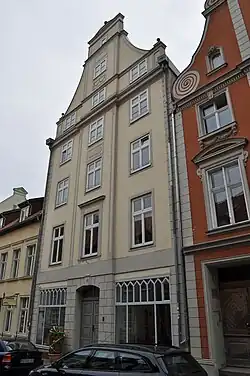 Das viergeschossige, dreiachsige Giebelhaus ist im Kern mittelalterlichen Ursprungs. Die verputzte Fassade wurde im Jahr 1800 gestaltet. Der Mittelrisalit tritt hervor und birgt zudem das segmentbogige Portal. In der Mitte des 19. Jahrhunderts wurden der Laden und die hölzerne Haustür eingebaut. Ein zweigeschossiger Schweifgiebel krönt das Gebäude.