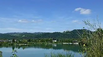 | Blick von Süden über den See, im Hintergrund der Hügelzug der Sattnitz mit der Hollenburg | ||