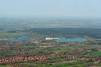 | Badesee Tannenhausen (links) von Süden gesehen, Mai 2013 | ||