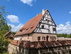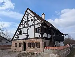 Im Sommer 2012 wurde es denkmalgerecht transloziert und wird seit 2017 im Fränkischen Freilandmuseum in der Stadt Bad Windsheim im Zustand der Zeit um 1500 wiederaufgebaut.[2][4] Sein neuer Standort liegt in der Ebene, nördlich der altenAisch auf einer Höhe von 307 m ü. NN. ⊙49.49415310.424427307
