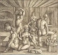 Eine zeitgenössische Bildquelle zeigt das Innere einer Badstube: Der Holzschnitt aus der Zeit von 1505–1510 stammt von einem Nachfolger Dürers und ist nach einer Federzeichnung des Meisters gearbeitet, die in der Kunsthalle Bremen aufbewahrt wird (Inv. Nr. 99-1851/57).[9] Es zeigt sechs Frauen, die verschiedene Handlungen des Badens zeigen: Zwagen (Haarewaschen), Krauen (eine Art "massieren" der Haut) und Lecken (die Verwendung eines aus Eichenlaub gebundenen Badequasts). Die im Bild gezeigte Holzvertäfelung entspricht ebenfalls den archäologischen Befunden.