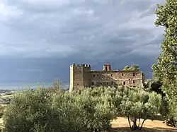 Die ganze Anlage bildet ein unregelmäßiges Rechteck, in dessen Zentrum ein Innenhof mit einem tiefen Ziehbrunnen liegt. An seiner nördlichen Seite steht die dem Heiligen Michael geweihte Kirche mit Campanile, im Südosten steht ein bergfriedartiger, zinnenbewehrter Turm.