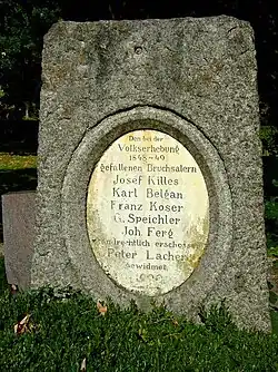 Auf dem ehemaligen Patientenfriedhof der Klinik Rastatt wurde 1899 ein Denkmal an die 19 Erschossenen errichtet. Die Kopfzeile lautet: Ruhestätte der im Jahr 1849 in Rastatt standrechtlich erschossenen FreiheitsKämpfer.[12]