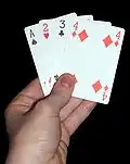 - 8♦ 3♣ A♥ A♠ gegen K♦ J♣ 9♠ 4♥: Die zweite Hand gewinnt, da sie aus vier Karten besteht und bei der ersten Hand eines der Asse gestrichen wird, so dass diese nur aus drei Karten besteht.