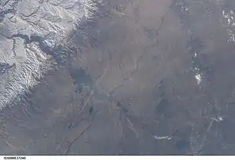 ![]() Aufnahme des Boysen Reservoir während der ISS-Expedition 6. Der Badwater Creek mündet, vom oberen Bildrand (Osten) kommend, in den Wind River. | ||