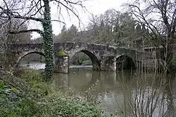 - Die dreibogige Brücke über die Célé stammt aus dem 13./14. Jahrhundert. Ihre drei Segmentbögen sind im Scheitelpunkt kaum merklich angespitzt. Die beiden in Fließrichtung spitz zulaufenden Pfeilerköpfe sorgen dafür, dass Äste und Baumstämme abgelenkt werden und sich nicht vor den Bögen verhaken. Der Fahr- und Gehweg ist mittig leicht erhöht. Das etwa 2,60 Meter breite und 33 Meter lange Brückenbauwerk wurde im Jahre 1951 als Monument historique anerkannt.[1]