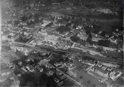 Im Hinblick auf die bevorstehende Elektrifizierung nahmen die SBB ab 1922 einen weiteren Ausbau vor. Es entstanden zwei Unterführungen, wobei die westliche bis zum Mittelperron und die östliche zur Hinteren Bahnhofstrasse führte. Da die Einsteighalle den späteren Fahrleitungen im Weg stand, musste sie abgebrochen werden. Stattdessen erhielten der neue Mittelperron und der verbreiterte Hausperron ein Dach. Die WTB baute 1924 auf der Südseite des Bahnhofs ein eigenes Aufnahmegebäude, einen rötlich-braun verputzten Heimatstilbau mit breiten Bogenfenstern, Vordach und angebautem Güterschuppen. Dadurch ging der direkte Anschluss an die AS verloren, die weiterhin durch die Bahnhofstrasse verkehrte. Der Bahnhofplatz erhielt eine neue Pflästerung, während das im Hinblick auf das Eidgenössische Schützenfest 1924 eingeweihte Schützendenkmal auf einem hohen Sockel inmitten einer Brunnenanlage einen optischen Anziehungspunkt in der Platzmitte bildete.[34] Der elektrische Betrieb auf der Hauptstrecke Zürich–Olten wurde am 21. Januar 1925 aufgenommen[24], auf der Zweigstrecke in Richtung Suhr am 15. Juli 1946.[35]