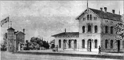 Beim Umbau wurde das Empfangsgebäude durch einen 1879 errichteten und 1892/93 erweiterten Neorenaissance-Bau ersetzt. In den Eckgebäuden befanden sich die Wohnungen der Beamten, im Mittelteil Diensträume, die Schalterhalle und die nach Klassen getrennten Warteräume.