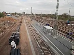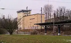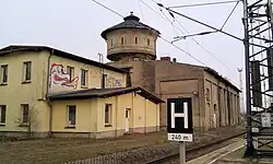 ![]() Empfangs- und Dienstgebäude, hinten Lokschuppen mit Wasserturm (2012; alles abgerissen 2017)