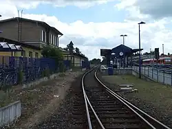 Vom Empfangsgebäude in der Bahnhofstraße führte der Tunnel zu den beiden Bahnsteigteilen. Direkt am zweistöckigen Empfangsgebäude, das aus unverputzten Backsteinen errichtet worden war, gab es einen angebauten Güterschuppen im Fachwerkstil, der unter anderem auch zur Gepäckaufbewahrung diente. Nach der Wende zog die Ortsteilbibliothek hier ein.