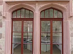 Das dem Turm südöstlich angebaute zweigeschossige Gebäude besitzt auf Vorder- und Rückseite über dem Traufgesims, das durchgehend auf steinernen Konsolen aufgesetzt einen Mauervorsprung bildet, eine steinerne Zinnenreihe, die nach außen abgeschrägten sind und über die Dachtraufe hinausragen. Die Giebel des Gebäudes schließen treppenförmig als Stufen- oder Staffelgiebel.