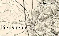 Die Main-Neckar-Eisenbahn-Gesellschaft (MNB) nahm am 22. Juni 1846 ihren Betrieb in dem Streckenabschnitt auf, an dem Bensheim liegt.[1] Der Ort erhielt damit auch seinen Bahnhof. 1851 bekam der heutige Ortsteil Auerbach – damals noch eine selbständige Gemeinde – einen eigenen Bahnhof.