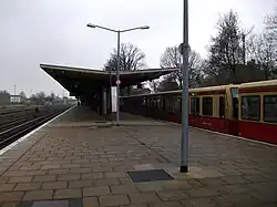 Das kleine Empfangsgebäude liegt nördlich der Gleise. Der Bahnhof verfügt über einen Mittelbahnsteig für die S-Bahn, der zu zwei Dritteln überdacht ist. Südlich schließen sich die Ferngleise und die ehemaligen Güterverkehrsanlagen an. Auf der Südseite der Gleise steht ein 1927 von Richard Brademann entworfenes Gleichrichterwerk für den S-Bahn-Verkehr, das unter Denkmalschutz steht.[7]