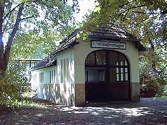 1908 wird der Bahnhofstunnel auf Antrag und Kosten der Einwohner Wilhelmshagens und von Woltersdorf-Schönblick eröffnet.[2] Der Grundbesitzerverein Schönblick ließ auch einen Fußweg von Schönblick zum Bahnhof Wilhelmshagen anlegen. Eine Umbenennung des Bahnhofs in Wilhelmshagen-Schönblick wurde jedoch nicht umgesetzt.[3]