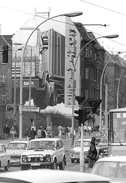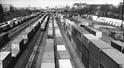 Von 1968 bis 1970 entstand im Bahnhofsgelände der erste Containerbahnhof der DDR, der von der Lichtenberger Seite der Bahn über eine eigens angelegte Zufahrtsstraße zugänglich war. Am 30. Juni 1968 fuhr von dort der erste Containerzug mit 30 Containern zum Überseehafen Rostock. Insgesamt 18 Aufstellflächen erlaubten den Umschlag von bis zu 1000 Containern am Tag, was von etwa 500 Berliner Betrieben genutzt wurde.[6] Als sichtbares Zeichen erhielt der Giebel eines Wohngebäudes an der Ecke Möllendorffstraße (damals: Jacques-Duclos-Straße) an der seinerzeit namenlosen Zufahrtsstraße ein Fassadenbild mit einem mit Container beladenen KamAZ-Lastkraftwagen.