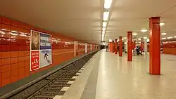 Die ursprüngliche Grundfarbe des Bahnhofs waren rote kleinteilige Fliesen. Diese wurde jedoch bei einer grundlegenden Sanierung in den 1980er Jahren in Orange geändert. Nach einer erneuten Sanierung im Jahr 2004 wurde das Rot durch eine neue Wandverkleidung wiederhergestellt. Gleichzeitig wurde ein Aufzug zwischen Bahnsteig und Zwischengeschoss eingebaut. Von dort aus kann auch das sich anschließende Einkaufszentrum Ring-Center I erreicht werden.