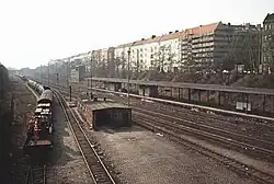 Güterbahnhof und stillgelegter S-Bahnsteig, ganz links am Bildrand der einstige Personenbahnsteig, im Vordergrund die Ladestraße der NME, 1988