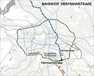 Lage des Bahnhofs Hermannstraße mit Markierung von Ringbahn, U-Bahn und Neukölln-Mittenwalder Eisenbahn