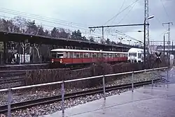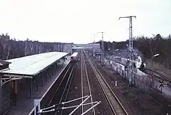 ![]() Links: Bahnhofsgebäude und S-Bahnsteig, rechts: Bahnsteig der Parkeisenbahn