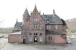 Der Bau zeichnet sich besonders durch seine roten Sandsteinquader aus und liegt zwischen Gleisanlage und Mainzer Straße. Mit dem roten Sandstein als Baumaterial und den gotischen Stilformen soll, ähnlich wie bei anderen Empfangsgebäuden an der Eifelstrecke, ein Bezug zur Landschaft und zur Heimatgeschichte hergestellt werden. Die mit Schildgiebeln abschließende Schalterhalle springt an beiden Längsseiten rechtwinklig hervor. Ihre Giebel werden zusätzlich durch Spitzbogenblenden betont. Der sich südlich an die Schalterhalle anschließende Gebäudeteil wird durch ein erkerartig vorspringendes Zwerchhaus akzentuiert. Die Giebelfelder der Nordseite sowie ihres Anbaus sind als Fachwerk ausgeführt.[6] Die prunkvolle Gestaltung wurde auch hier wie bei vielen anderen Bahnhöfen an der Eifelstrecke von den Kriegsschulden, die Frankreich nach dem Deutsch-Französischen Krieg zu leisten hatte, bezahlt.[3]