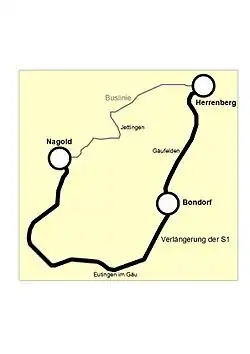 2011 hatte sich die Stadt Nagold um eine Direktverbindung in die baden-württembergische Landeshauptstadt Stuttgart bemüht. Nachdem die Planungen für eine Verlängerung der Linie S6 der S-Bahn Stuttgart nach Nagold verworfen wurden, wurde nach einer weiteren Lösung gesucht. Es wurde die Verlängerung der Linie S1 in Betracht gezogen, die momentan in Herrenberg endet. Da eine Neubaustrecke parallel zur B 28 (Ulm–Kehl) mit nur zwei Haltepunkten als zu teuer galt, wurde eine Linienführung über die Bahnstrecke Eutingen im Gäu–Schiltach und die Nagoldtalbahn geprüft. Diese führt auch über Bondorf. Die Gemeinde würde laut Gutachter von dieser neuen Verbindung sehr profitieren. Am Schluss wurde das Projekt wegen der zu langen Fahrzeit gegenüber der bereits bestehenden Bus-Verbindung Herrenberg–Nagold verworfen – allerdings hält dieser nicht in Bondorf.[3]