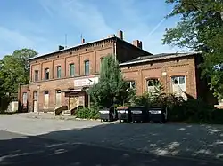 Das Empfangsgebäude ist ein im Kern zweigeschossiger und siebenachsiger Ziegelbau mit Walmdach mit anschließendem dreiachsigen Gaststättentrakt. Im zentralen Teil des Gebäudes lagen Fahrkartenausgabe, Diensträume und der Wartesaal I. und II. Klasse, das Obergeschoss beherbergte Dienstwohnungen für Bahnbedienstete eingerichtet.[5]