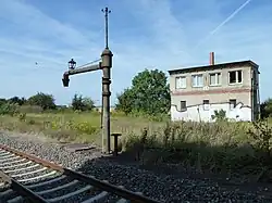 Im Dreieck der sich gabelnden Strecken befand sich das erste Stellwerk. Es trug zunächst die Bezeichnung „WB I“. 1911 hieß in einem Gleisplan „Cw“. Ein neues mechanisches Stellwerk, ebenfalls „Cw“, der Bauart Einheit entstand im Jahre 1936 westlich auf der gegenüberliegenden Seite der Kanonenbahn. Ein weiteres Stellwerk mit der Bezeichnung „Cof“ kam 1902 hinzu, eine neue Hebelbank der Bauart Jüdel wurde um 1914 eingebaut. Nach Ausbau der Gleisanlagen für den Anschluss der Werkbahn des Schachtofenwerkes wurde noch ein drittes Stellwerk vermutlich in den frühen 1950er Jahren errichtet.[7] Es war eines der Bauart Einheit mit der Bezeichnung „W1“. Das Befehlsstellwerk gegenüber dem Empfangsgebäude erhielt die Bezeichnung B2, das Stellwerk an der Streckengabelung W3.