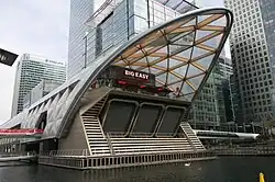 Der Bahnhof befindet sich 28 Meter unter dem nördlichen Hafenbecken der West India Docks, zwischen dem HSBC Tower auf der Südseite und der Billingsgate-Fischmarkthalle auf der Nordseite. Der Gebäudekomplex erstreckt sich in West-Ost-Richtung und ragt ähnlich wie ein Schiff aus der östlichen Hälfte des Beckens hervor.[1] Die nüchtern gestaltete Gleisebene verfügt über einen 250 Meter langen Mittelbahnsteig. Eine Überleitstelle am westlichen Ende ermöglicht das Wenden von Zügen.[2] Über der Gleisebene erhebt sich das sechs Stockwerke hohe Einkaufs- und Freizeitzentrum Crossrail Place, wobei zwei Stockwerke über dem Wasserspiegel liegen. Auf dem obersten Stockwerk befindet sich ein Dachgarten, der von einer 310 Meter langen, futuristisch wirkenden Dachkonstruktion aus Glas umschlossen wird. Dessen hölzerner Rahmen wird von Stahlknoten und durchsichtigen Plastikröhren zusammengehalten.[1]