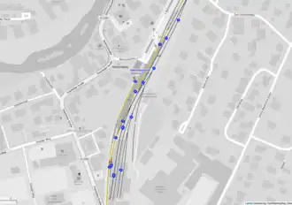 ![]() Bahnhof Ebermannstadt – links das Stumpfgleis der Deutschen Bahn, rechts die Anlagen der Dampfbahn Fränkische Schweiz (DFS)