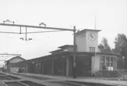 Das 1944 erbaute Empfangsgebäude umfasst nebst dem Hauptgebäude einen nach Norden halbrund ablaufenden Anbau und einen Uhrturm, in dem das Treppenhaus untergebracht ist.[4] Der Bau ist ein Baudenkmal nationaler Bedeutung, vor allem wegen seiner ungewöhnlichen Modernität. Des Weiteren umfasste er ein Bildstellwerk. So wurde der Bahnhof auf einer Briefmarke verewigt und der deutsche Modellbahnzubehörhersteller Faller hatte ein Modell des Bahnhofs in seinem Sortiment.[5] Heute ist er mit einem gelben Fassadenanstrich versehen.
